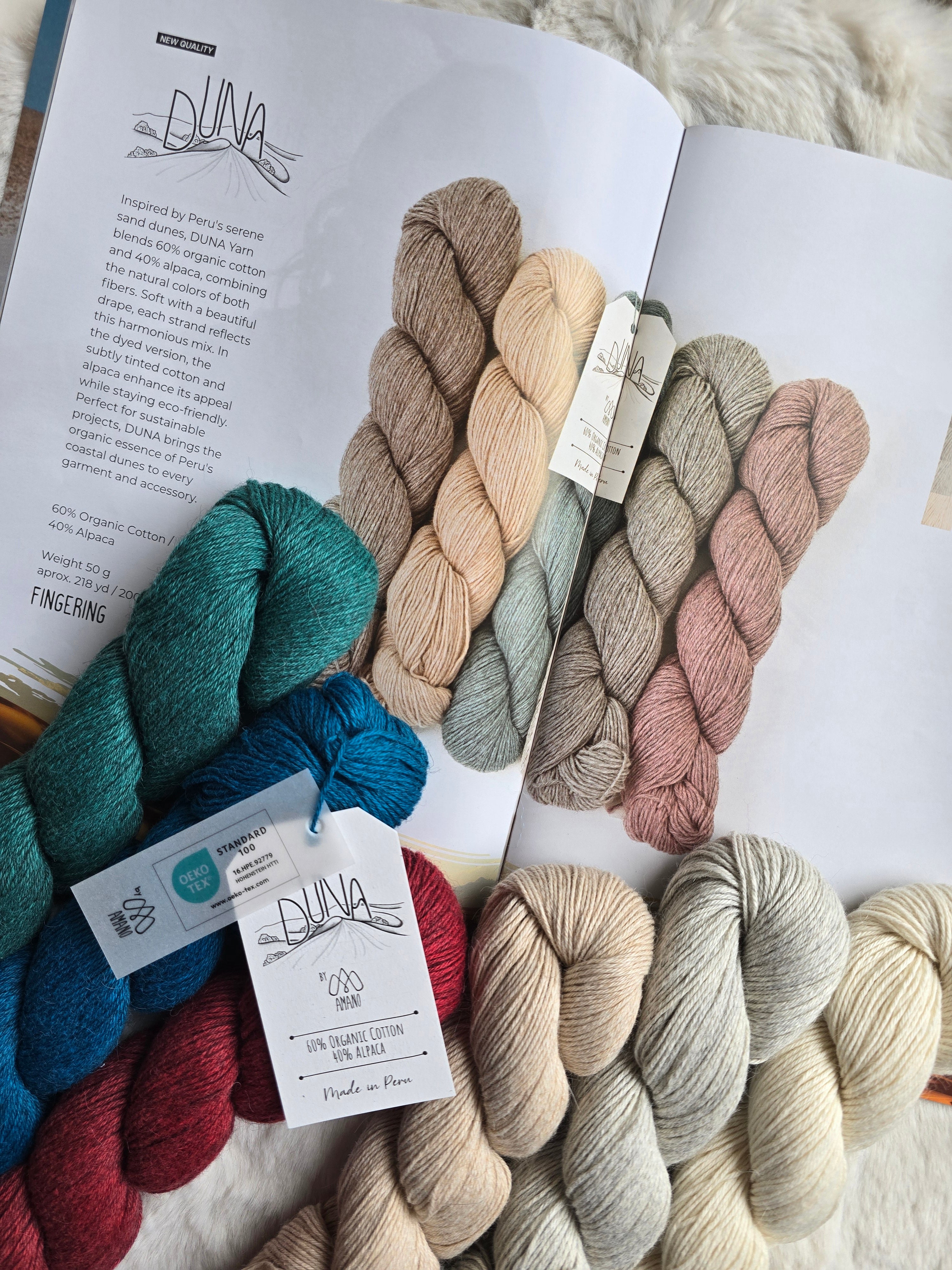 Duna combina el color natural del algodón orgánico con suaves tonos de alpaca naturalmente coloreada. En nuestra versión teñida, el algodón orgánico y la base de alpaca añaden un sutil toque de color sin perder las propiedades ecológicas del hilo. Ideal para proyectos conscientes del medio ambiente, Duna inspira prendas y accesorios que capturan la esencia orgánica de las dunas costeras de Perú, aportando belleza natural a cada creación.
